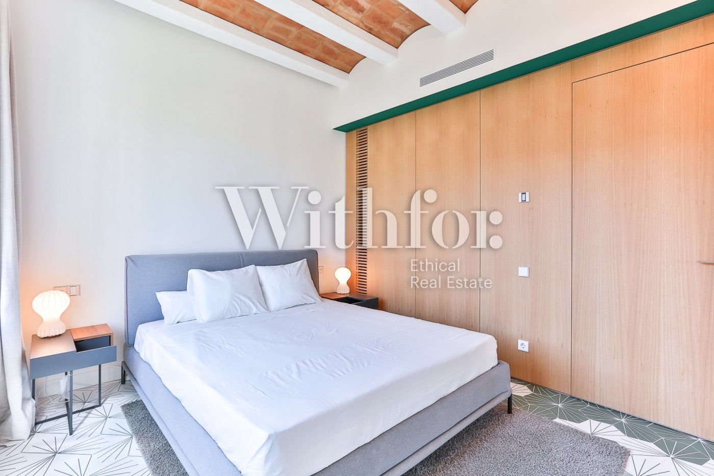 Techos con bóveda catalana, luminosos y amplios espacios, grandes ventanales, suelo de gres porcelánico que combina el blanco y el verde, amplios armarios empotrados y acabados de alta calidad y diseño para toda la propiedad.